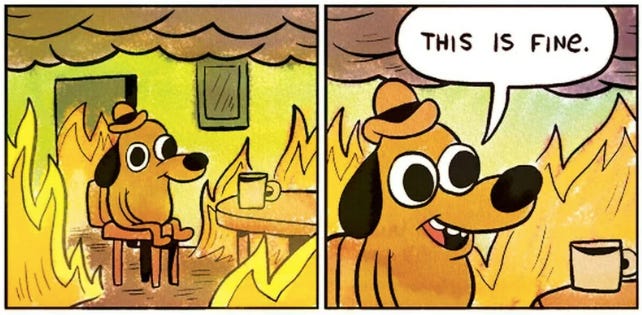 I had become a mother, a wife, went back to school for the third time in search of financial stability through a “practical” career in healthcare, and from the outside had checked all the boxes. Like the doggo in the On Fire meme, I was denying the raging dissatisfaction I’d felt crept in despite having lived out the script I was thought to have performed and performed quite well.